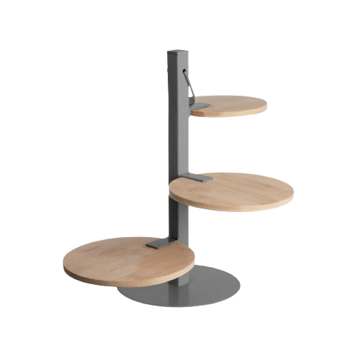 De toren is gemaakt van metaal in een grijze kleur en de plateaus zijn van bamboe, in een mooie naturel kleur. De plateaus hebben een diameter van 16 cm en de toren heeft een totale hoogte van 30,5 cm. Aan de bovenzijde zit een stevige leren lus waarmee je de etagère eenvoudig kunt verplaatsen.