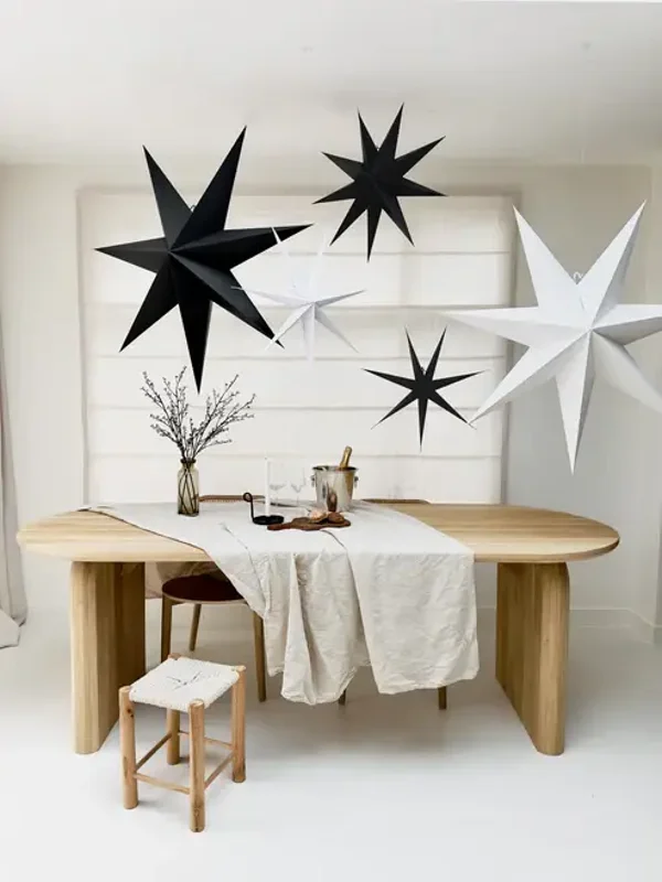 Met hun minimalistische en elegante design passen deze kerststerren zowel in een subtiele als een opvallende setting. Kies een kleinere ster van 45 cm voor een ingetogen look of een grote papieren kerstster van 100 cm voor een echte blikvanger. Onze papieren kerststerren zijn niet alleen stijlvol, maar ook herbruikbaar, waardoor ze een duurzame keuze zijn voor je kerstdecoratie.